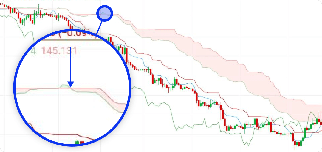 - Garis Konversi / Garis Dasar Crossover Bearish: sinyal jual yang paling mudah adalah ketika Garis Konversi melintas di bawah Garis Dasar. Hal ini menunjukkan pergeseran yang akan datang ke tren bearish dan dapat berfungsi sebagai titik masuk untuk menjual aset Anda.