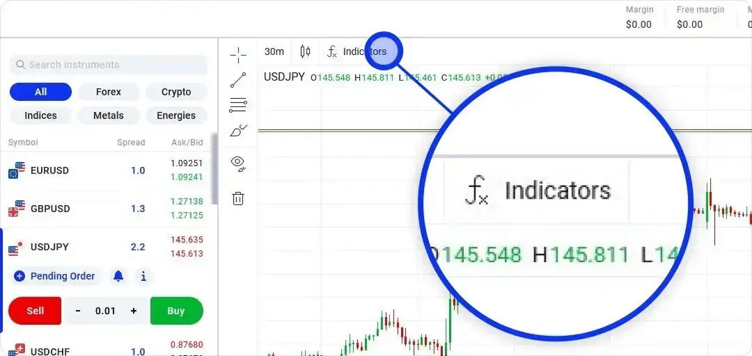 Untuk menginstal indikator, buka Elev8Trader dan tekan tombol Indikator di atas jendela grafik.
